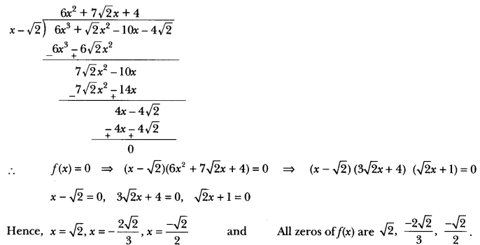 • The given polynomial is f(x) = (6x3 +√2x2 – 10x – 4√2). Since √2 is the zero of f(x), it follows that (x – √2) is a factor of f(x).